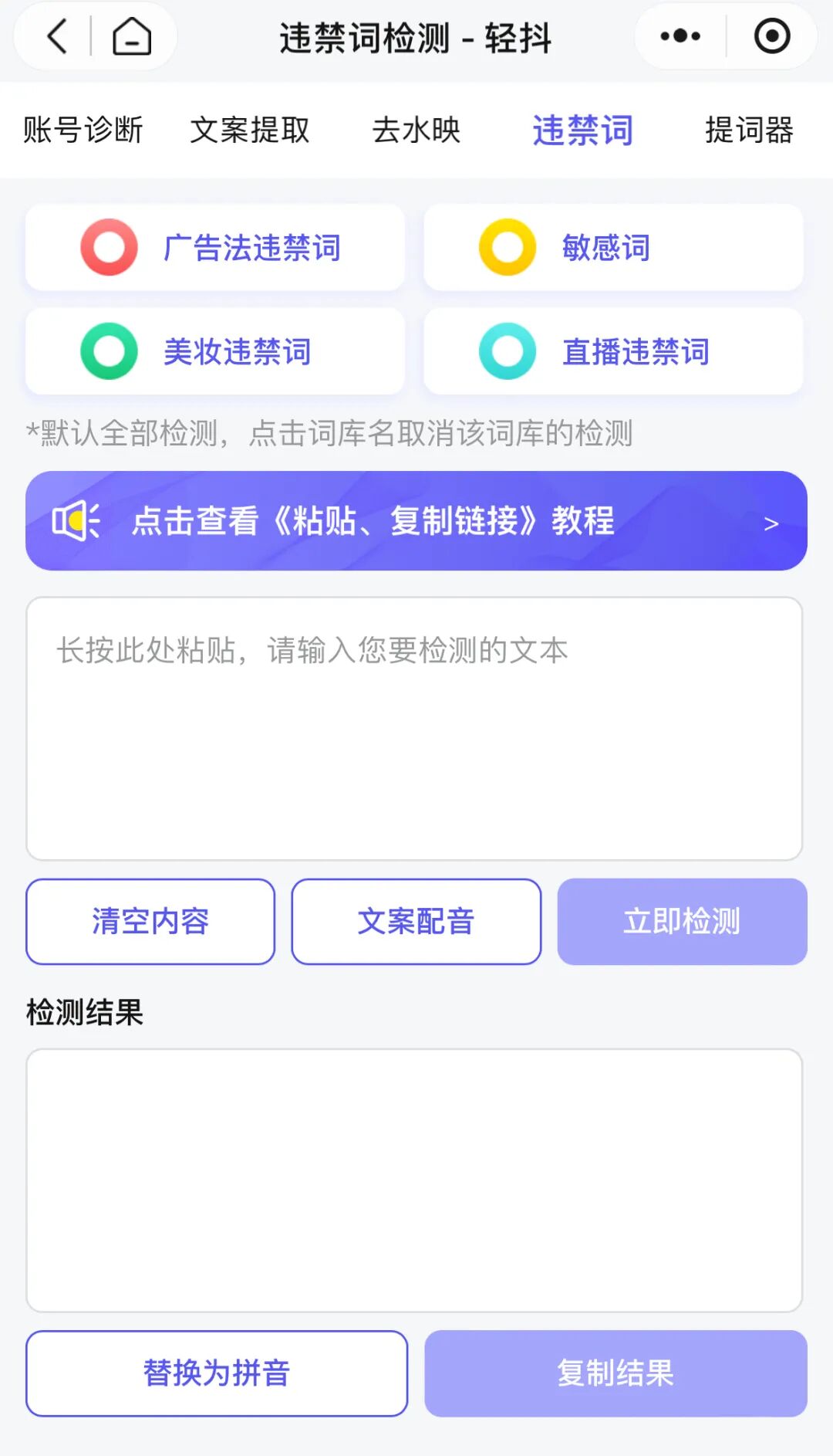 在新媒体运营的世界里,内容创作者需要应对诸多挑战,其中之一就是如何确保发布的内容符合平台规则,避免因使用违禁词而遭受下架处理。对于新手来说,掌握各种平台的违禁词并非易事。因此,一键检测违禁词的工具变得尤为重要。