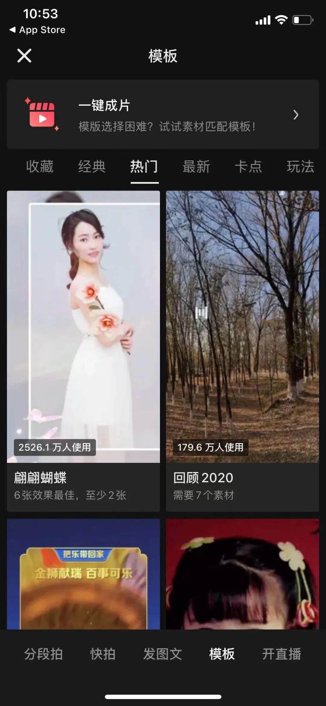 再比如抖音,普通人要拍一段质量不错的视频还是有难度的,因为从选题、拍摄到剪辑中间环节还是比较多的,很多用户其实都不知道拍些什么,而通过视频模板工具,大大降低了普通用户的创作成本。