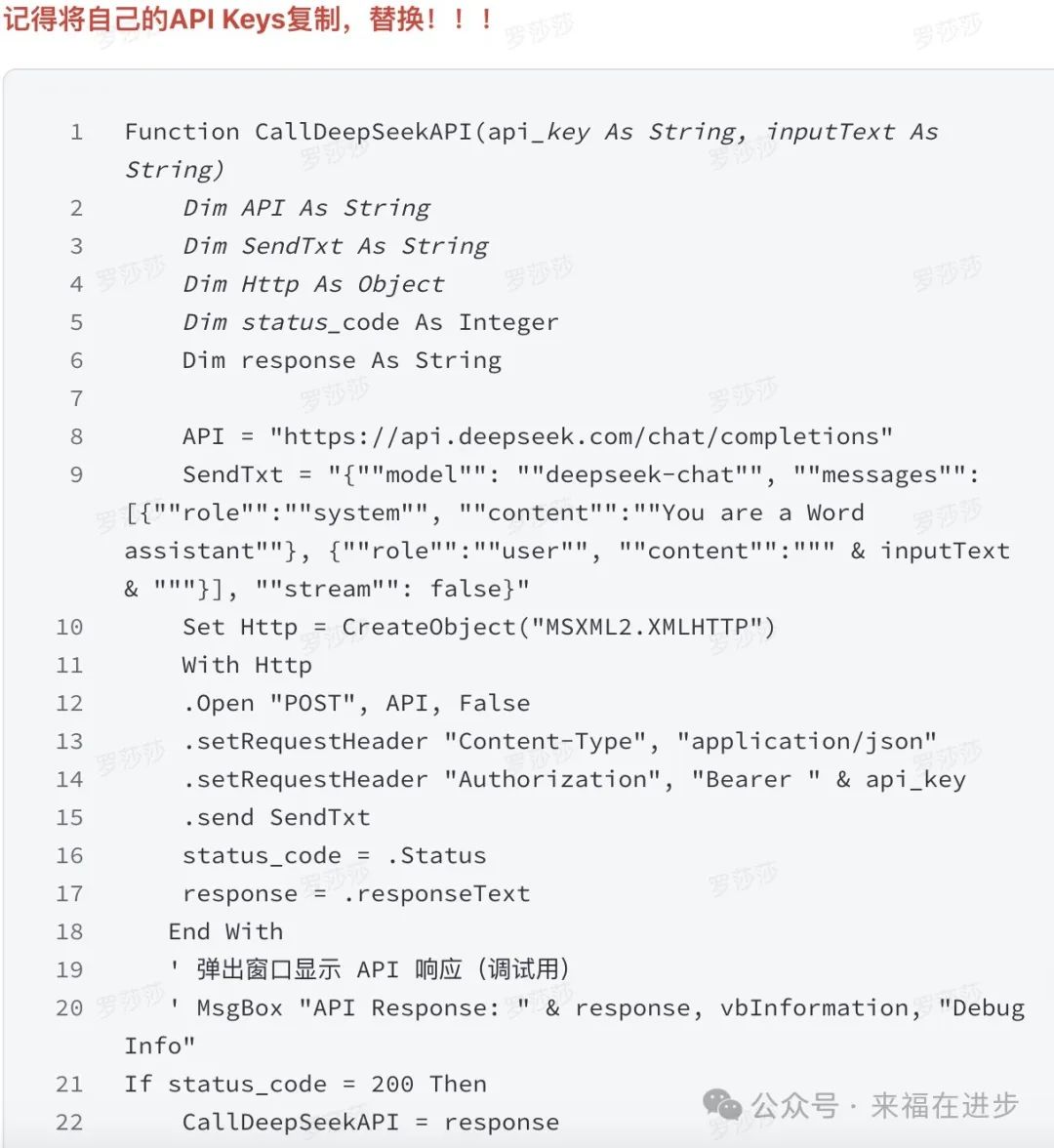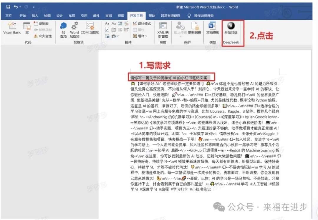 办公效率翻倍!如何让Word与Deepseek完美融合(保姆级教程)营销圈9个月前更新关注私信02289 hi,我是来福,研究Deepseek几个月,致力于把AI变成我们的高效办公助理,帮助我们降本增效,今天分析一篇技术贴,建议收藏并转发给朋友。 Deepseek是超强大的语言模型,接入word后相当于为文档配备了一个智能高效助手,无论查找资料、优化表达、在线翻译都非常方便。 效果展示: 操作步骤展示: 一、打开Deepseek官网,进入API平台 官网:https://www.deepseek.com/ 二、创建一个API Keys并复制 3.配置word 1)新建一个wrod 2)点击左上角文件 3)点击选项 4)勾选开发者工具 5)设置信任中心 6)点击 开发者工具的visual basic 7)插入模块 8)粘贴代码 9)回到word,添加新组 10)重命名新组 11)为新组添加宏 12)重命名 宏 恭喜你,到这里我们就完成配置了! 四、测试 输入问题指令后,点击“开始对话”就可以啦 © 版权声明文章版权归原作者所有,未经允许请勿转载。THE END转载# 效率 喜欢就支持一下吧点赞9 分享QQ空间微博QQ好友海报分享复制链接收藏