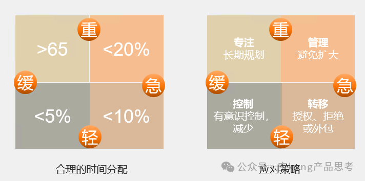理想情况下,重要且紧急的事情需要控制在20%以下,紧急但不重要的事情控制在10%以下,既不重要也不紧急的事情在5%以下,更多的时间留给重要但不紧急的事情,最好在65%以上。