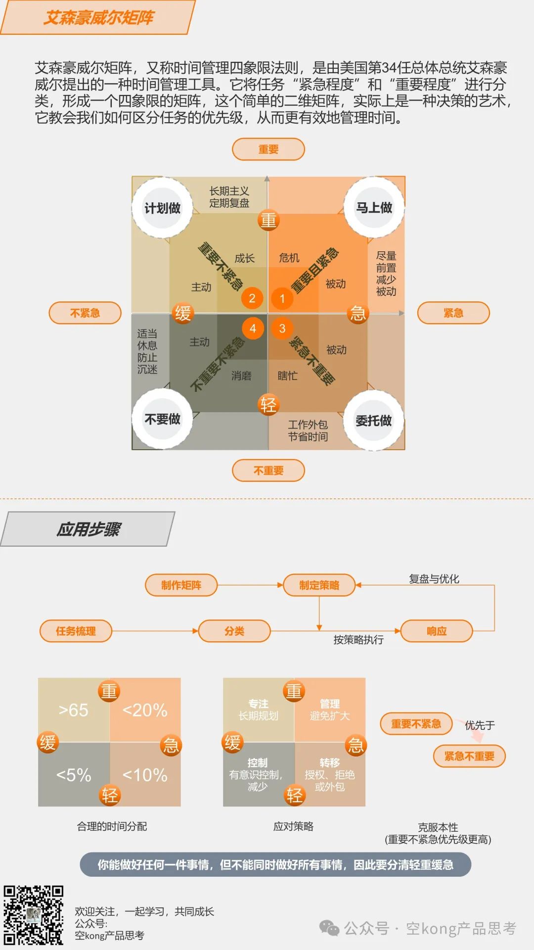 本来以为这个思维模型非常简单,就是在事情多、任务杂的时候用来处理优先级的。但深入了解下来,发现这是一个值得并且需要长期实践和优化的模型,忙的时候用于区分优先级、闲的时候用于做长期有意义的事情,它总能让我们的时间过得更有价值。